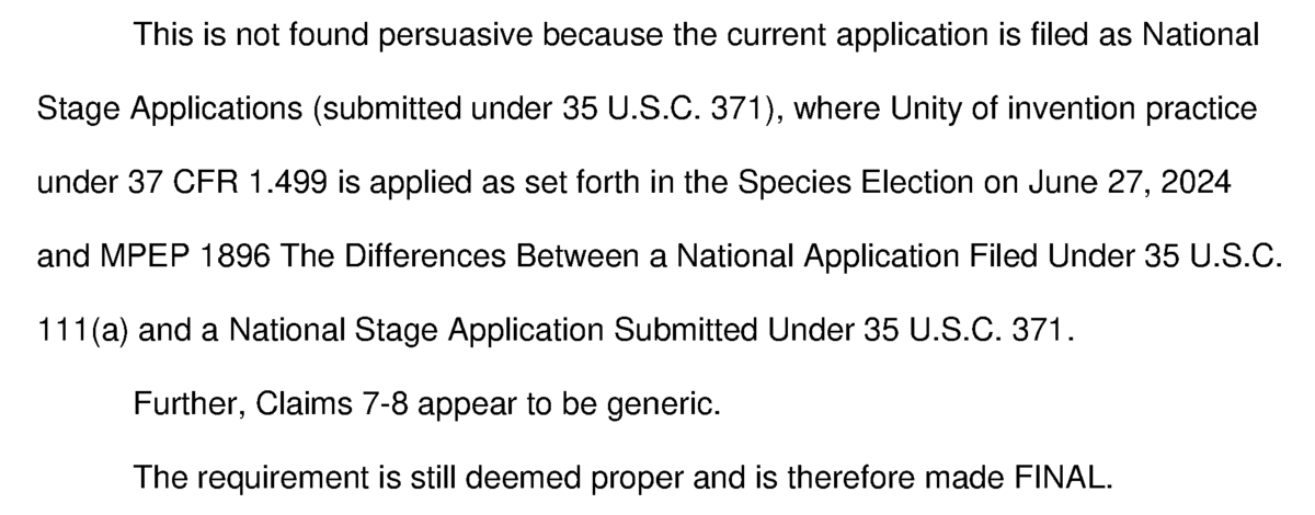 MPEP § 803 規(guī)定“If the search and examination of all the claims in an application can be made without serious burden, the examiner must examine them on the merits, even though they include claims to independent or distinct inventions”,即,如果可以在沒有嚴重負擔(dān)的情況下對申請中的所有權(quán)利要求進行檢索和審查,則審查員必須根據(jù)案情對其進行審查,即使它們包括獨立或不同發(fā)明的權(quán)利要求。如果申請人對RR的回復(fù)是帶有爭辯的(with traverse),該爭辯可以保留未來對RR進行申訴的權(quán)利,且審查員需要對該爭辯做出回應(yīng)。這樣的回應(yīng)可能是審查員同意撤回RR,然而,更可能的是審查員發(fā)出Final RR,維持前次的RR意見,審查員通常在Final RR中僅對RR的理由稍作調(diào)整。