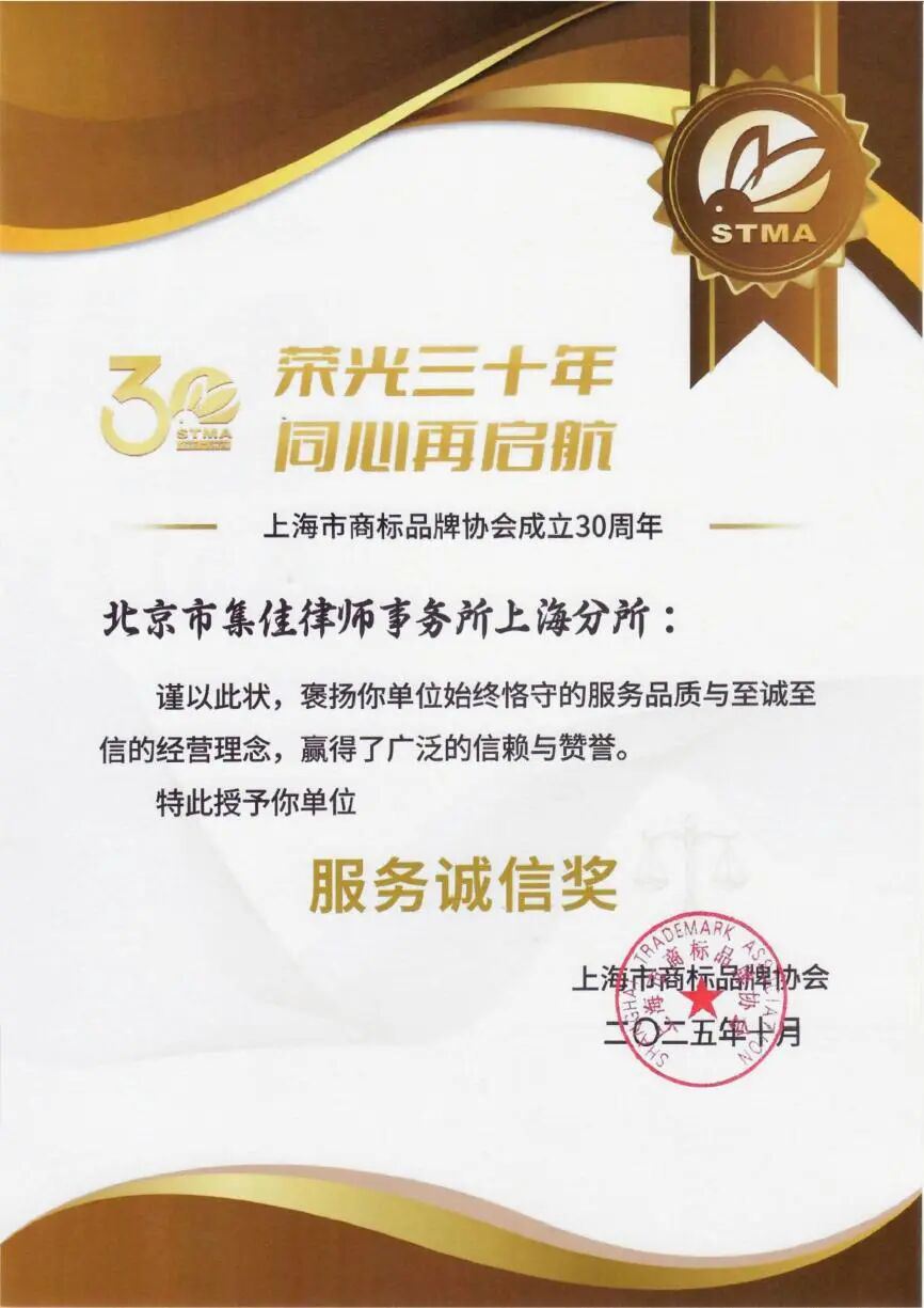 這些榮譽(yù),既是肯定,更是前行的號(hào)角。展望未來(lái),集佳上海分所將以此為勵(lì),秉持“客戶至上”的初心,在專業(yè)領(lǐng)域深耕不輟,持續(xù)深化專業(yè)知識(shí),優(yōu)化服務(wù)流程與體驗(yàn)。我們期待與上海市商標(biāo)品牌協(xié)會(huì)、業(yè)界同仁及所有信任我們的客戶攜手同行,共同推動(dòng)中國(guó)商標(biāo)品牌事業(yè)邁向更加繁榮的明天。