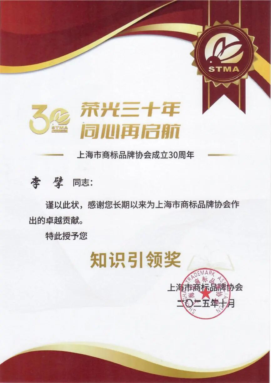 2025年10月16日,“榮光三十年·同心再啟航”上海市商標(biāo)品牌協(xié)會(huì)成立30周年慶典在上海隆重開(kāi)幕,會(huì)上表彰了對(duì)商標(biāo)品牌領(lǐng)域作出突出貢獻(xiàn)的單位及個(gè)人,表彰了2024-2025年度典型商標(biāo)代理案例、典型商標(biāo)代理案例提名。