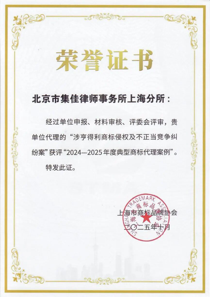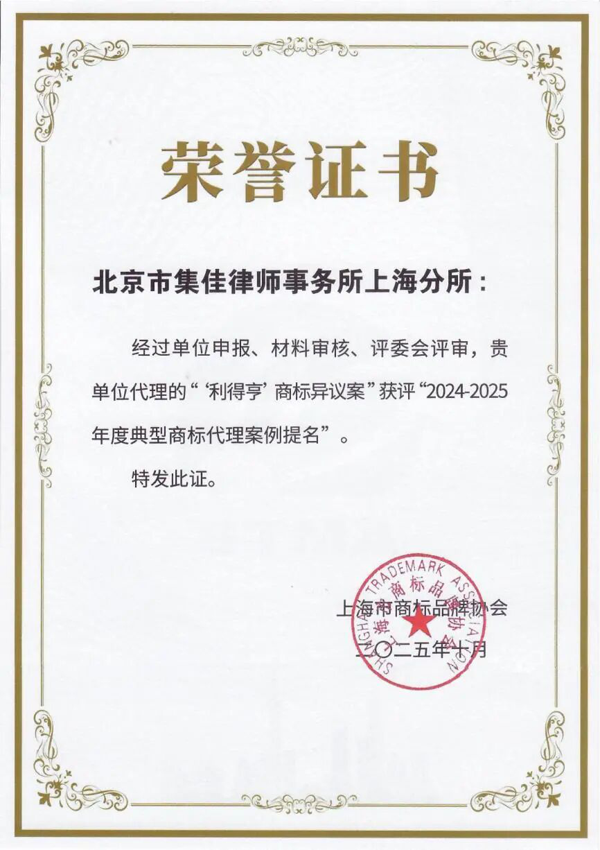 集佳上海分所辦理的“‘利得亨’商標(biāo)異議案”獲評(píng)“2024-2025年度典型商標(biāo)代理案例提名”